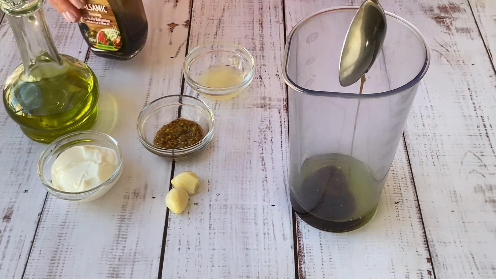 صب زيت الزيتون وخل البلسميك في كوب الخلاط اليدوي.